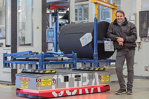 Bislang mussten die Mitarbeiter an der großen Beschichtungsmaschine BPH ihren Arbeitsplatz verlassen, um die produzierten Mutterrollen weiterzugeben. Außerdem mussten sie mit einem Hubwagen neue Leergestelle für die Aufwicklung der nächsten Mutterrollen platzieren. Diese Leergestelle wiederum wurden von Kollegen aus der Transportlogistik bereitgestellt. Durch unser FTS gehören solche manuellen Prozesse der Vergangenheit an. Der Roboter hat diese Aufgaben übernommen und transportiert automatisch fertige Mutterrollen ab und liefert neue Leergestelle an. Und das freut Serkan Cira sichtlich: „Der erfolgreiche Einsatz des FTS sorgt für weniger Stillstand in der Bänderproduktion und freie Kapazitäten. Meine Kollegen können sich jetzt auf Tätigkeiten konzentrieren, bei denen menschliche Fachkräfte unersetzlich sind.“